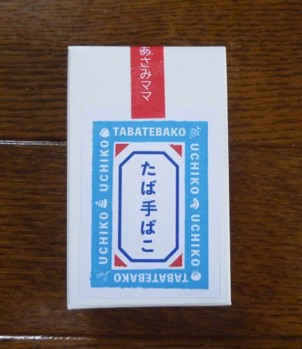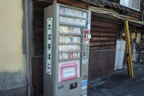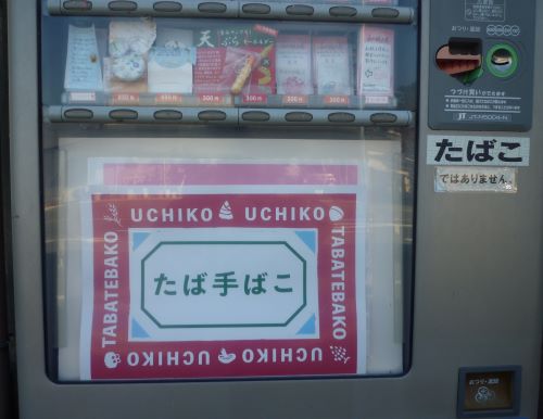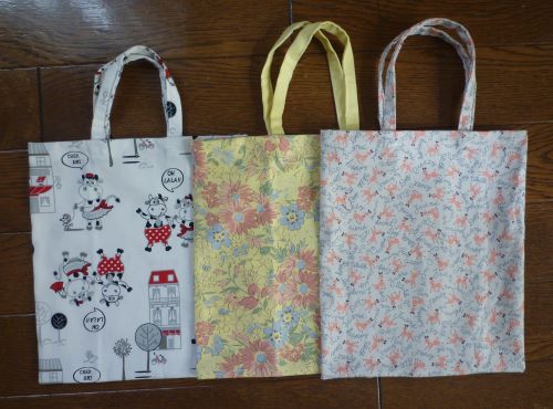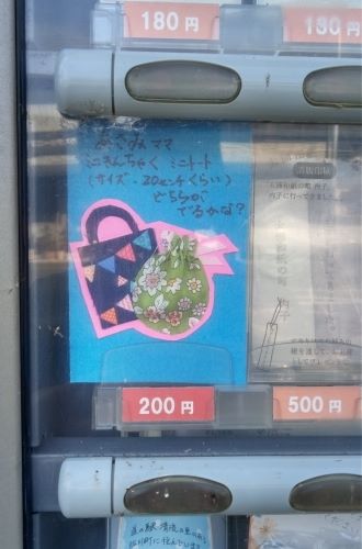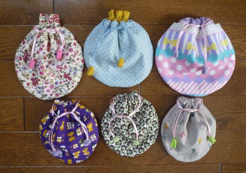 すでに全国 的にもメジャーになっている平岡地区の折り紙自販機をヒントに、手作り作品をパッ ケージして、使われていないたばこの自販機に入れて販売してみてはどうかというアイ デアから生まれた、その名も「たば手ばこ」というネーミングの自販機が五十崎地区 に設置されています。その手作り作品用としてにぎやかしに手提げ袋と巾着袋をつ くりました。なかなかかわいい出来栄えです。 |