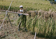左の写真は稲木架けをする、季羽浅喜さんです。
